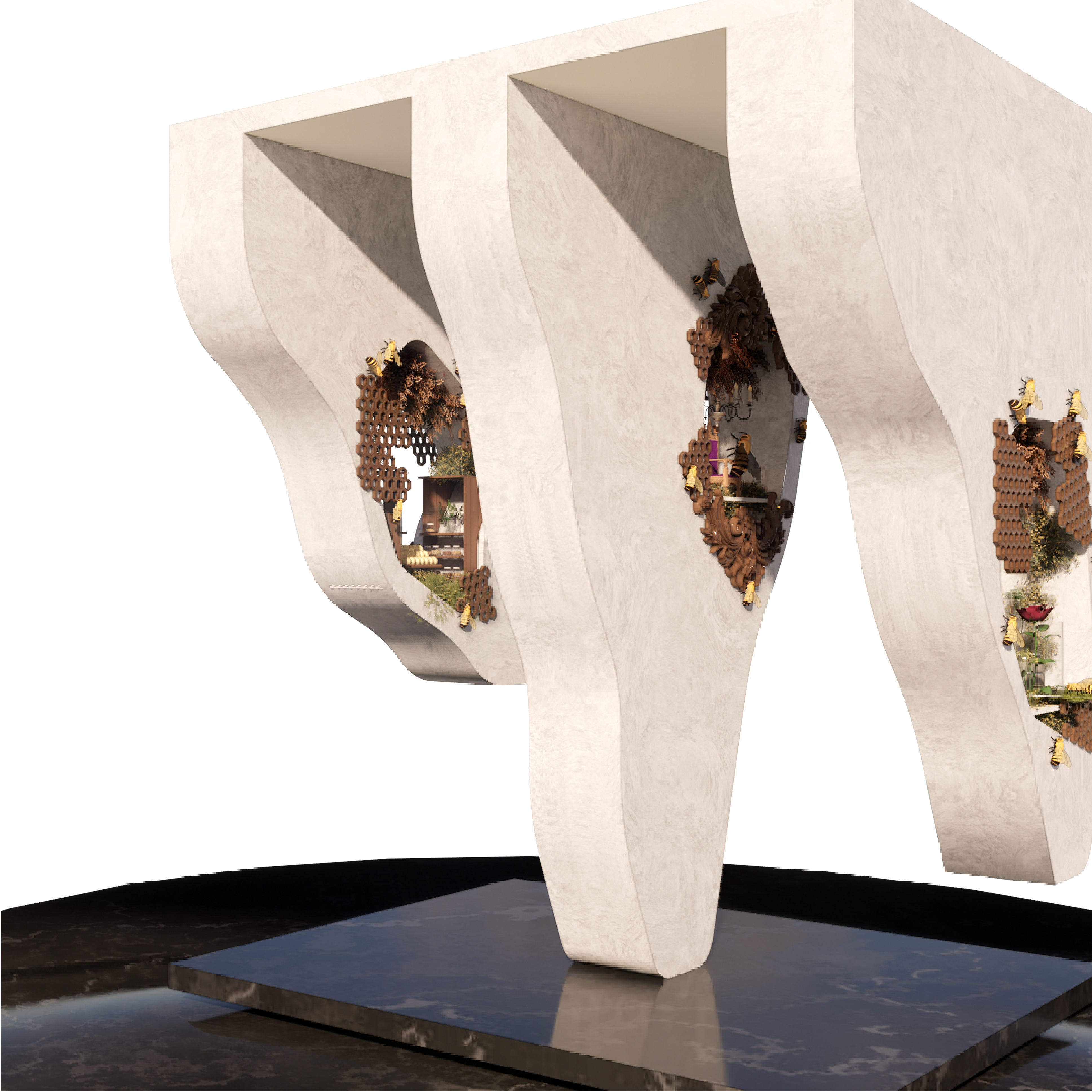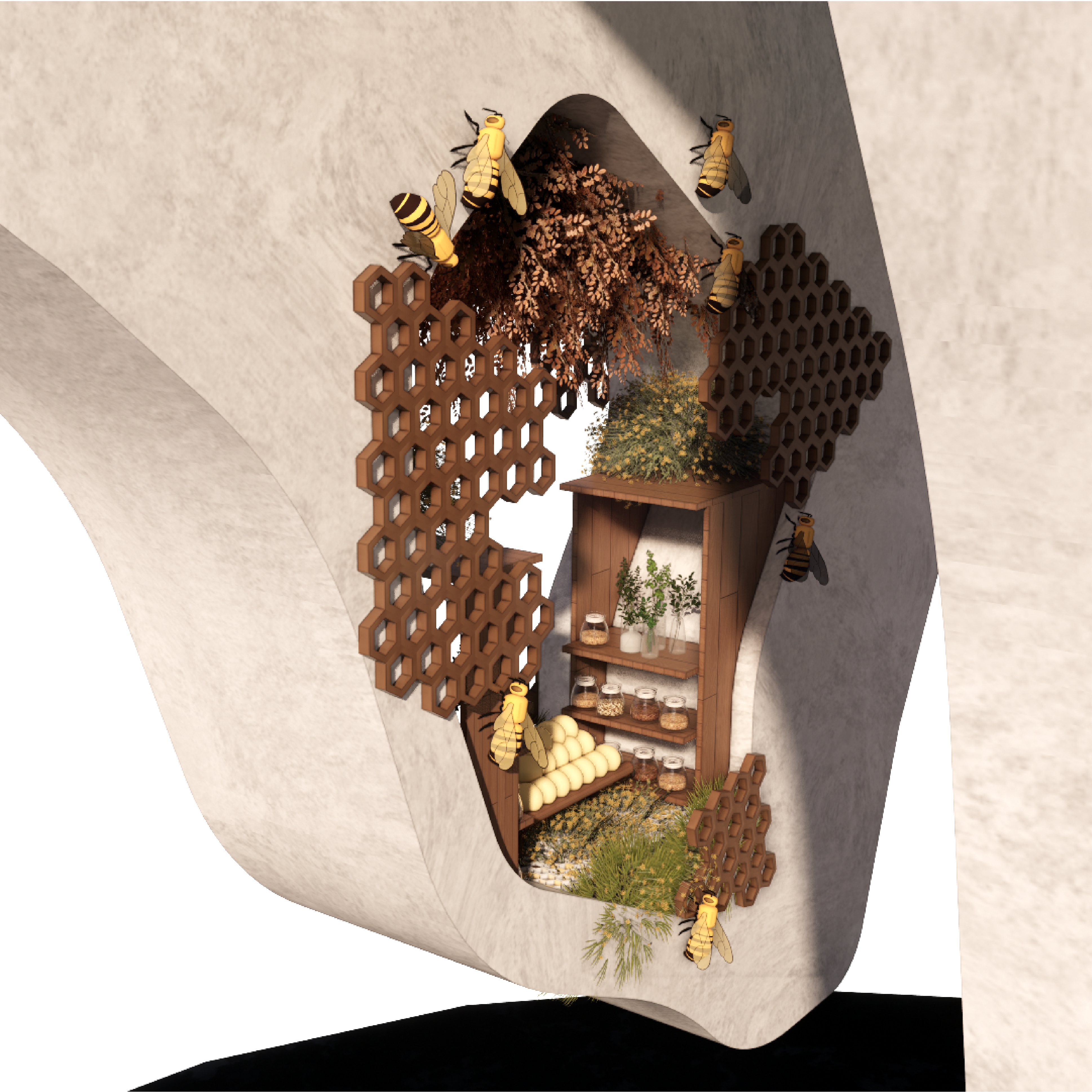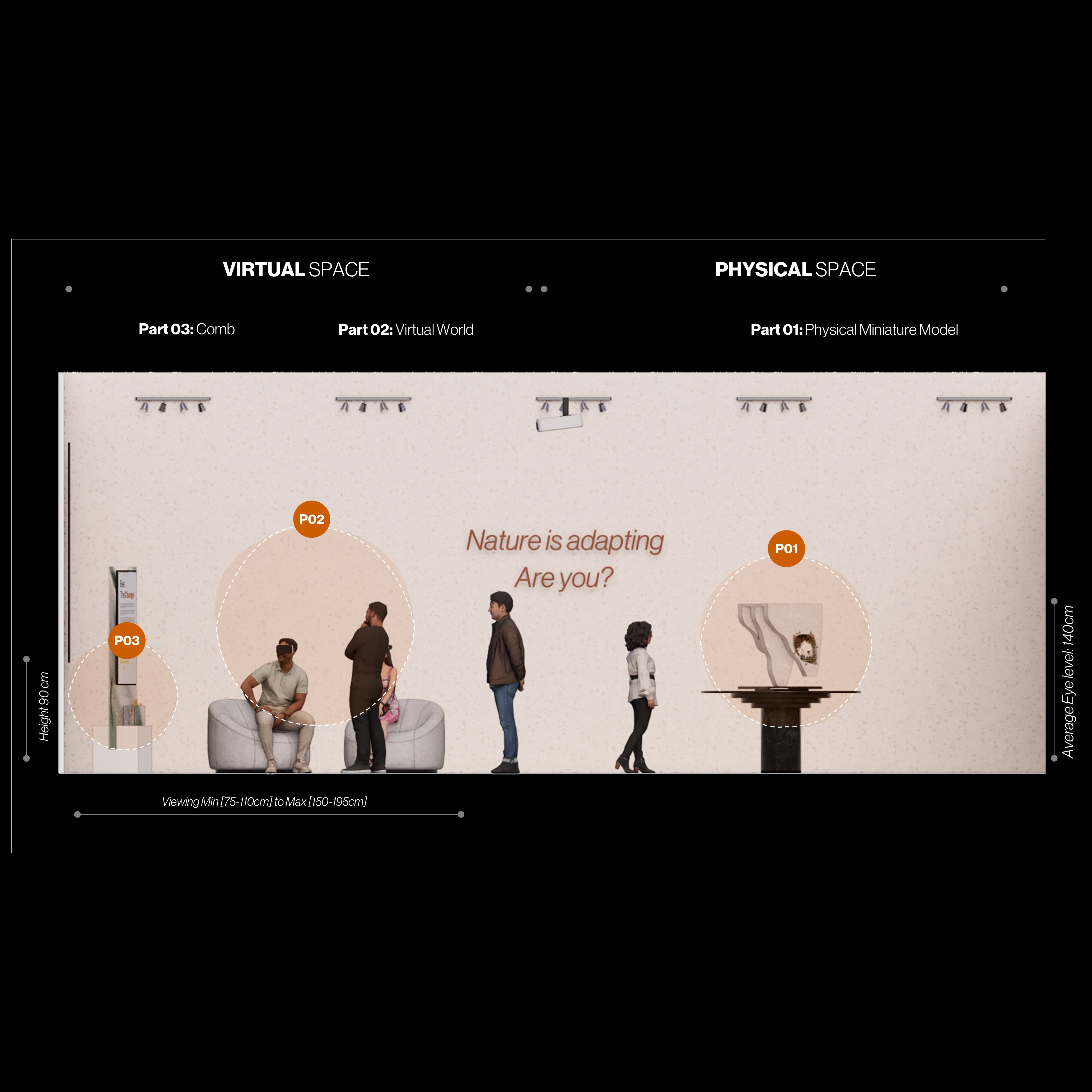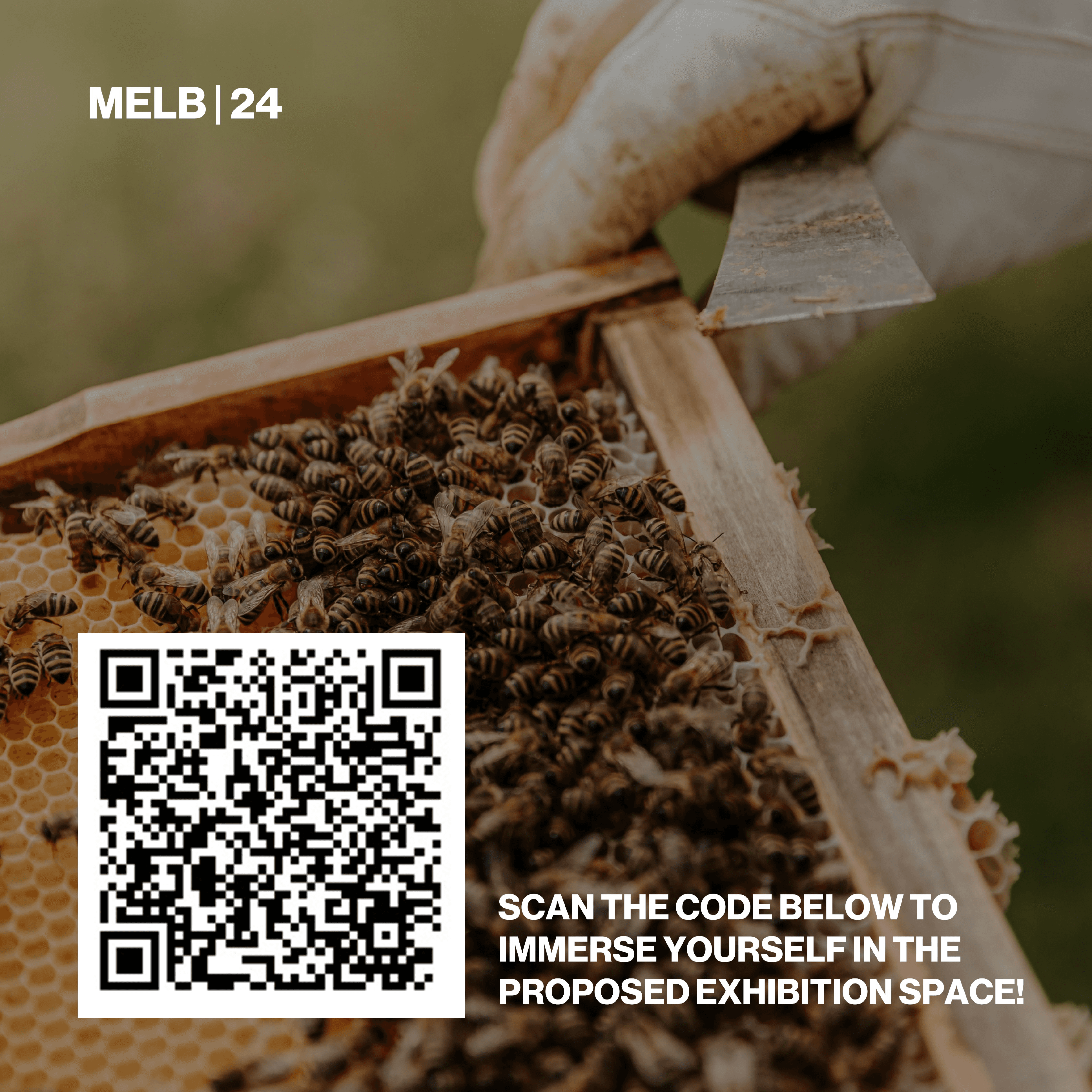 In a world facing the consequences of rising temperatures and climate change, this exhibition design studio presents a narrative of guidance and hope through a speculative lens. By creating a fictional representation of bees and flowers, we explore the resilience and adaptability of nature and offer insights into how humans might learn to coexist with a changing environment. The exhibition aims to inspire a shift in perspective by showcasing the long-term strategies of fictional bees, who focus on creating sustainable ecosystems and breaking negative feedback loops. In contrast, human responses often exacerbate the problem by relying on artificial solutions like increased air conditioning, which further contributes to environmental issues. Divided into two parts—physical miniature models and virtual experiences—the exhibit tells a story set in a post-apocalyptic future where humans struggle to cope with the rapidly changing climate. Amidst this struggle, they discover how the fictional bees have transformed the deteriorating urban landscape into vibrant pockets of nature. Through their adaptive behaviors and fictionalized mutated flowers, the bees breathe new life into the city. Visitors are invited to immerse themselves in the virtual world of the fictional bees, experiencing how these creatures navigate a challenging environment and create thriving ecosystems. The virtual world is complemented by physical dioramas depicting urban settings revitalized by the bees' innovative adaptations. "Bee the Change" serves as a call to action, urging visitors to reflect on their own behaviors and learn from the resilience and sustainability exemplified by the fictional bees. By understanding the wisdom of nature, we can embrace change in ways that promote harmony with our environment and secure a better future for generations to come.