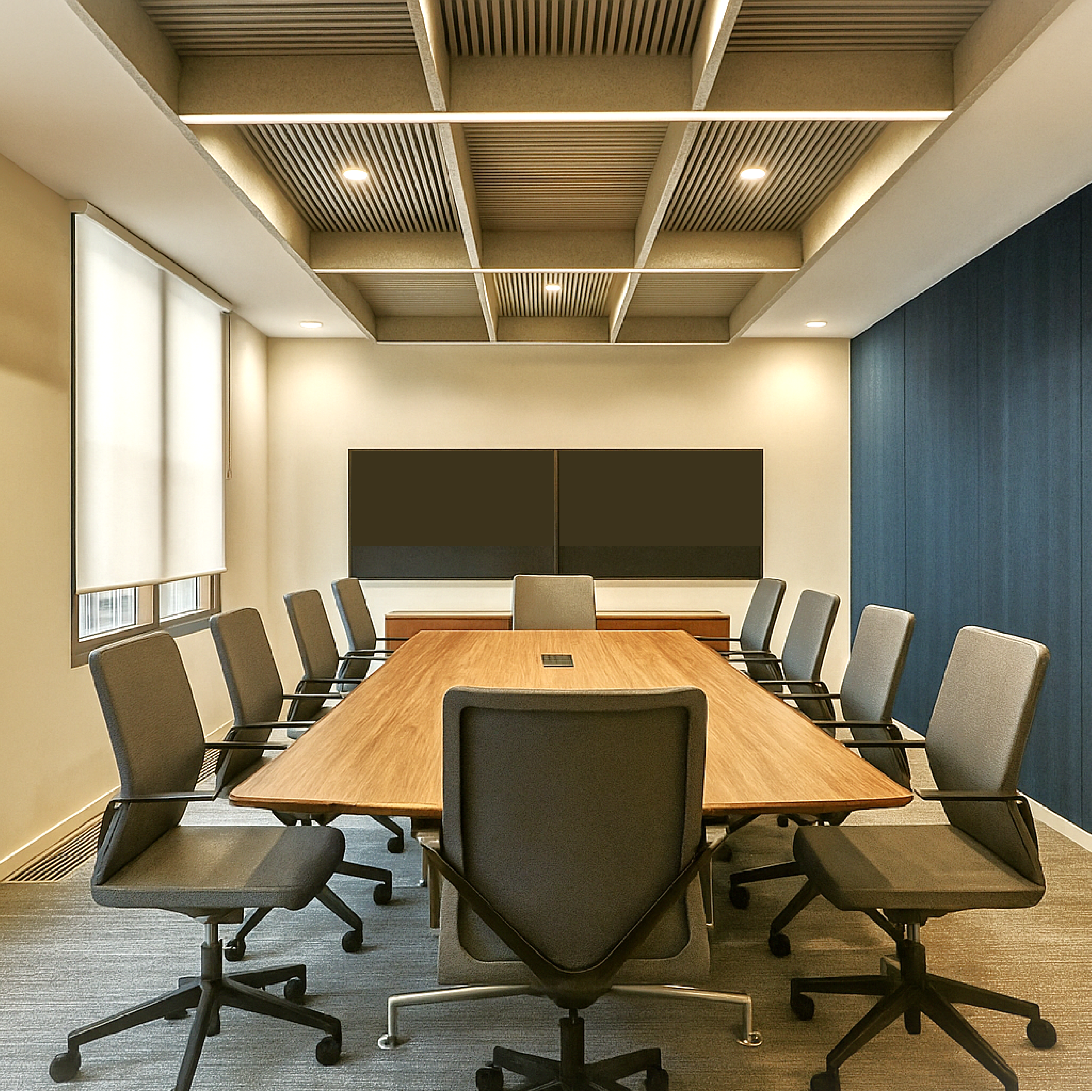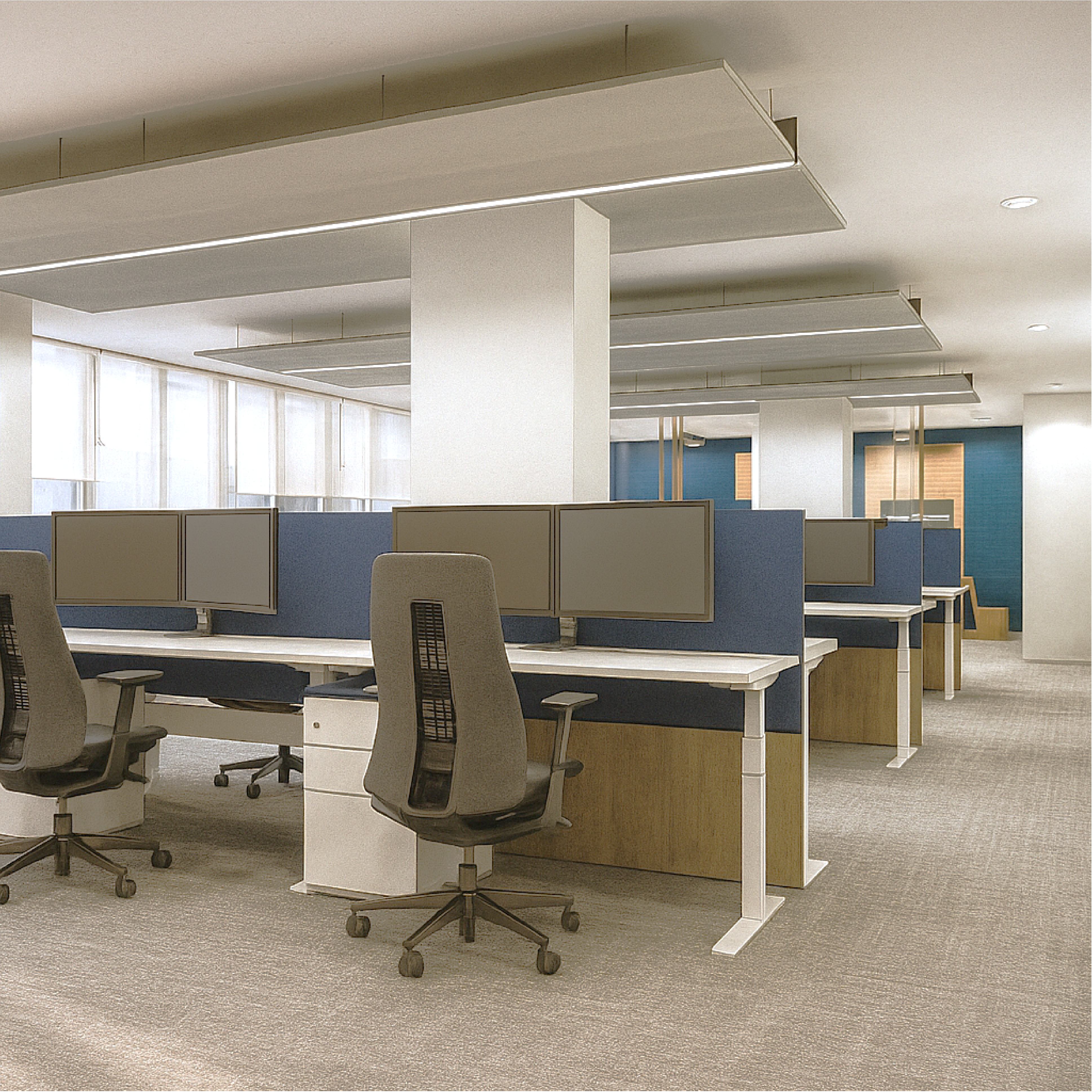 THIS PROJECT DELIVERED A NEW WORKPLACE FOR A GLOBAL FINANCIAL SERVICES ORGANISATION, WHERE THE BIGGEST CHALLENGE WAS TO CREATE A SPACE THAT FELT SIMPLE, YET STRATEGICALLY CONSIDERED IN EVERY DETAIL. THE DESIGN LANGUAGE WAS SLEEK, CLEAN, AND MINIMAL, REFLECTING PROFESSIONALISM WHILE REMAINING WELCOMING. A PALETTE OF LIGHT MATERIALS AND CALM BLUE ACCENTS PROVIDED A SENSE OF TRUST AND STABILITY, WHILE SUBTLE FURNITURE AND MINIMAL DETAILING BROUGHT REFINEMENT WITHOUT EXCESS. THE RESULT WAS A TIMELESS WORKPLACE THAT PROVED SIMPLICITY IS OFTEN THE MOST DIFFICULT DESIGN TASK. I WAS INVOLVED ACROSS THE ENTIRE PROJECT JOURNEY: FROM CONCEPT DESIGN AND MOOD BOARDS, TO MATERIAL AND FURNITURE SELECTION, CLIENT PRESENTATIONS, AND FINALLY THROUGH TO THE DEVELOPMENT OF THE CONSTRUCTION DRAWING SET. THIS HANDS-ON PROCESS ALLOWED ME TO CONNECT STRATEGIC THINKING WITH DETAILED DELIVERY, ENSURING THE ORIGINAL VISION WAS CARRIED THROUGH TO COMPLETION.