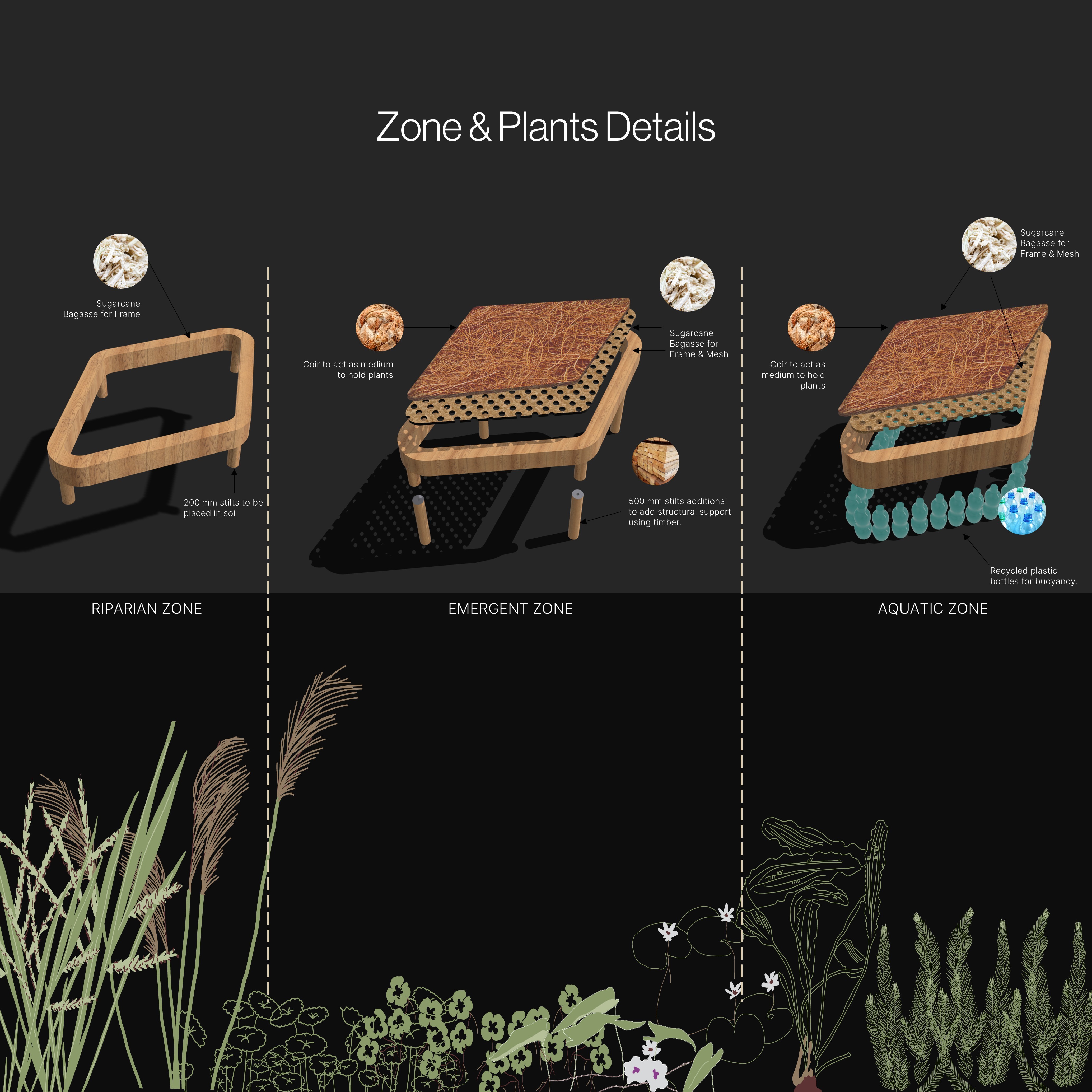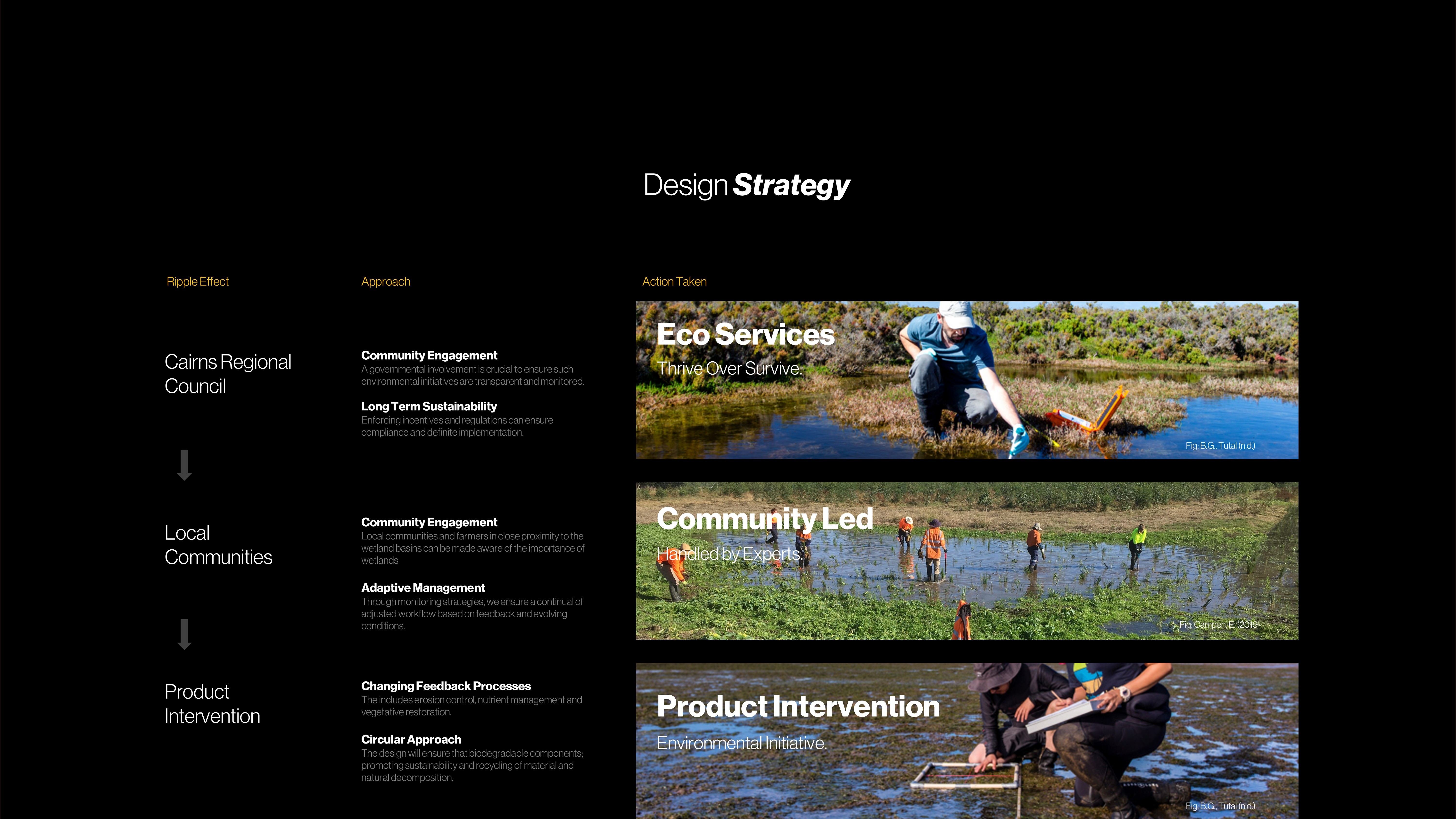 ReMarsh is a design proposition for a buffer system that responds to the needs of the natural environment, using a nature-based approach to rehabilitate and alleviate pressure on existing wetlands in Cairns from construction & agricultural runoff. The project operates on three levels. Firstly, it runs through the lens of a governmental perspective, suggesting the involvement of the Cairns Regional Council. Secondly, the governmental body collaborates with experts, including farmers and local residents, who take responsibility for running and managing the project. Thirdly, experts play a crucial role in educating and raising awareness within the community. All three levels collaborate to advance a product intervention that functions as a buffer system, actively contributing to the rejuvenation and prosperity of the wetlands. The project’s vision underwent significant transformation, evolving from a threat-oriented perspective into a more holistic approach. Initially focused on addressing sedimentation and eutrophication, the strategies were systematically sorted and visualized to define “Places to Intervene in the System.” Through critical discussions, the vision expanded to incorporate concepts of the commons and unintended consequences. This led to the establishment of “The Ripple Effect,” highlighting the interconnection of different levers within the system. The vision now reflects a holistic approach that benefits not only the environment but also all living users within the ecosystem, helping to map potentials, bottlenecks, and areas of optimization.