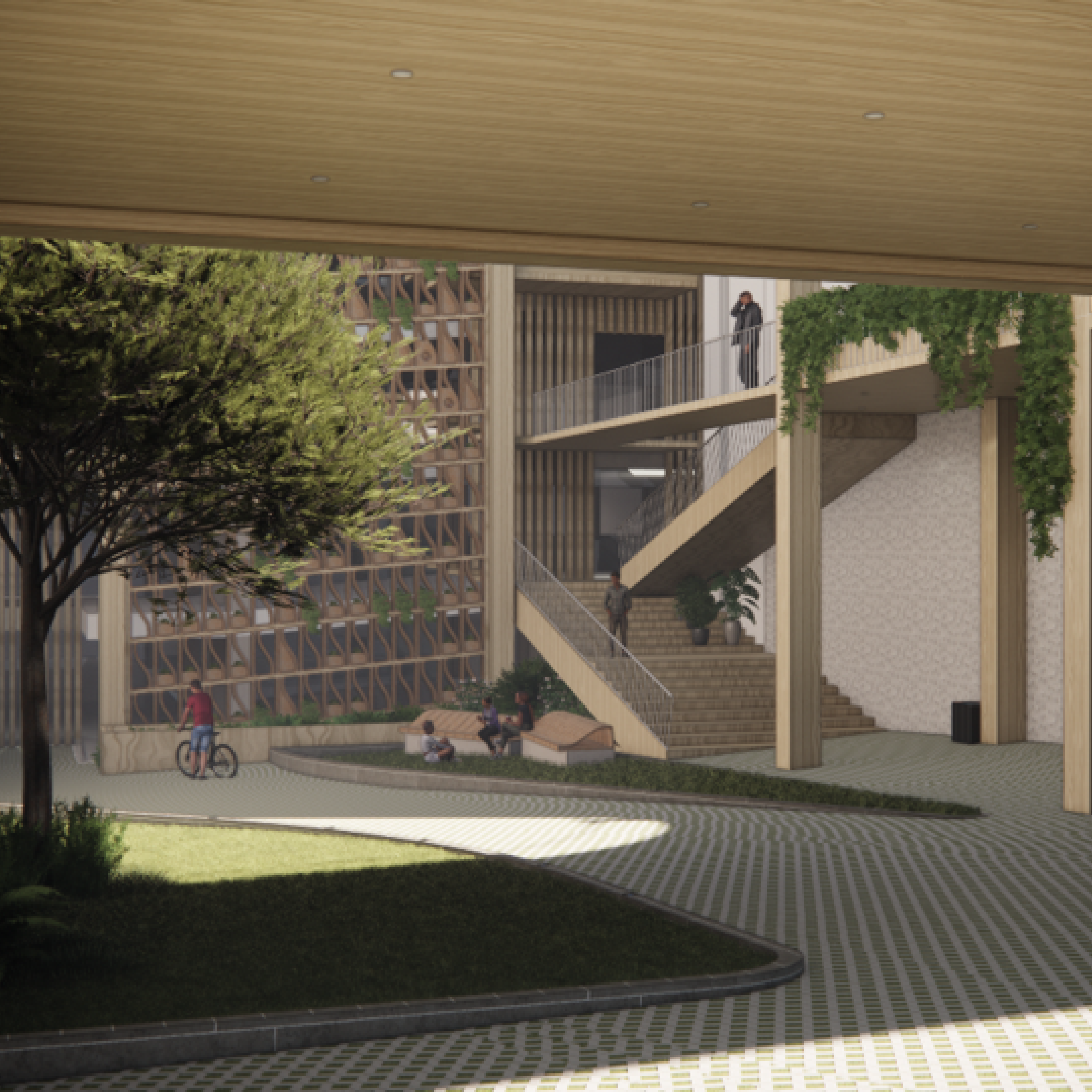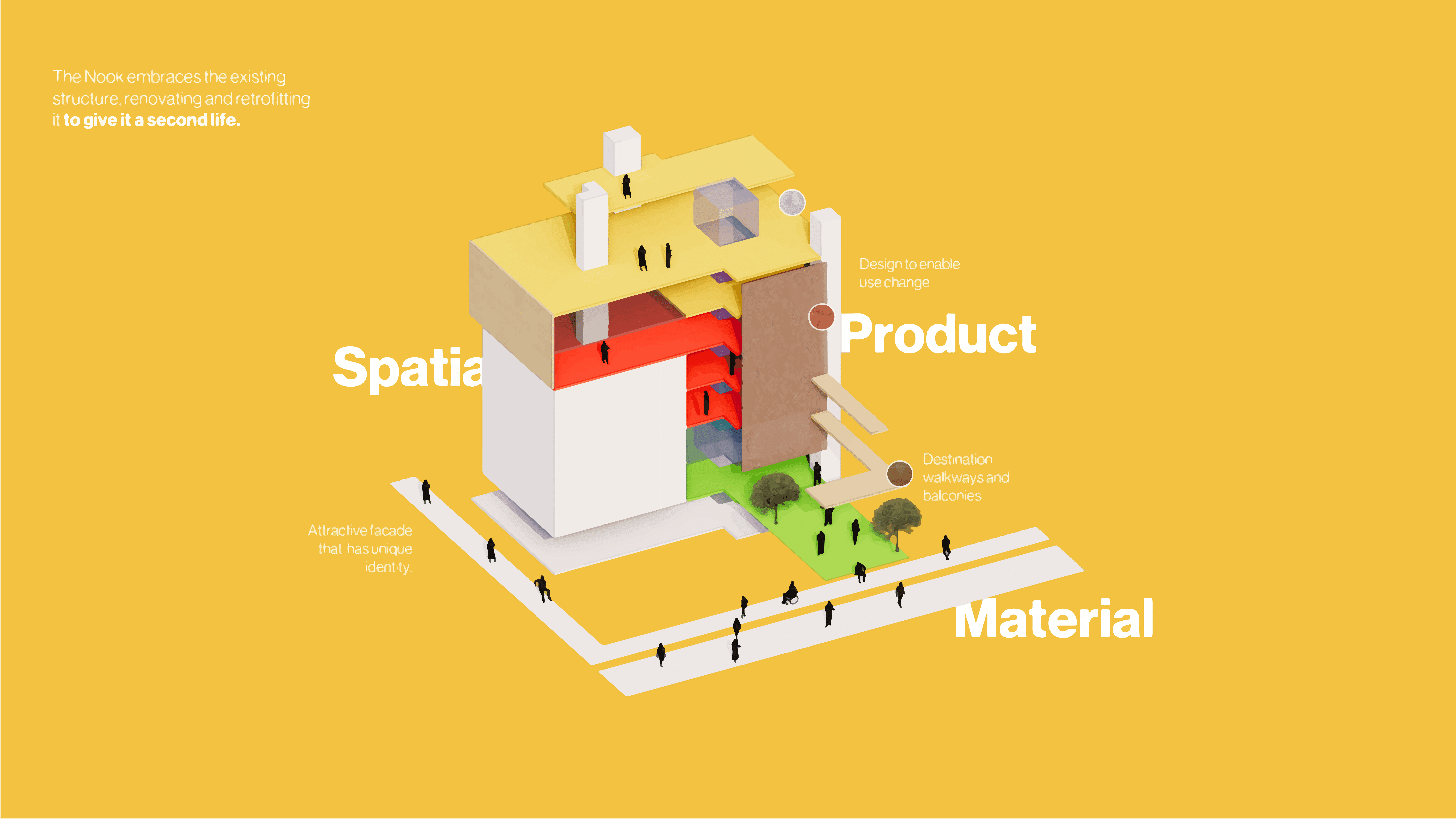 The Nook transforms an underutilised car park on Cardigan Street, Carlton, into a dynamic third space through regenerative, system-led, place based, and material-driven design. This Melbourne project weaves together spatial and product design strategies to foster meaningful connections between transient stakeholders and urban wildlife. Guided by More-Than-Human principles, the deep retrofit approach establishes environments where human activities harmoniously coexist with urban ecology. The design shifts away from mono-functional car parks toward spaces that enhance both community wellbeing and biodiversity. The project culminates in an Adaptive Framework for Regeneration that surpasses traditional circular design practices. This replicable model offers systematic solutions for urban renewal, grounded in local context and place-based transformation. The Nook demonstrates how design intervention can revitalise urban dead spaces into thriving ecosystems where human and nonhuman communities flourish together.